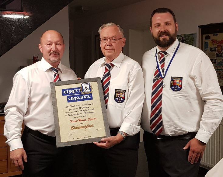 Unsere Sappeurkameraden Werner Neukirchen wurde für 25 Jahre und Lothar Bertrams für 40 Jahre Mitgliedschaft im Sappeurkorps und im Schützenregiment -